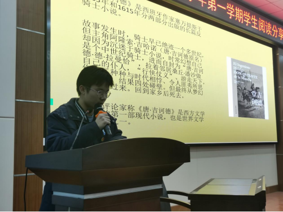 他从小小的房间走出来,带着发扬骑士道的执着,却不知自己被粗暴地投进的是另外一番世界,没有人相信骑士精神、只有庸常琐事的世界。在这个世界上,从头到尾都没有人和他并肩作战,他自始至终都是孤零零一个人,只为坚守着自己的价值。他是那个世界唯一金光闪闪的人,却在那个拒绝接受他的世界里屡屡碰壁。高二(11)班李长山等同学以情景剧的形式为大家讲述了唐吉诃德的故事。
