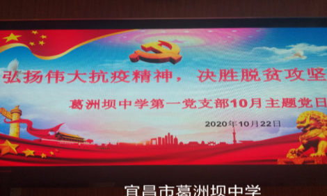 2020年10月22日,中共宜昌市葛洲坝中学第三支部召开了新学期的第二次主题党日活动,活动主题为“弘扬伟大抗疫精神 决胜脱贫攻坚”。