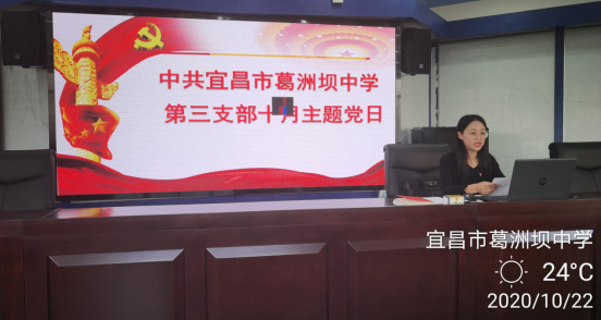 2020年10月22日,中共宜昌市葛洲坝中学第三支部召开了新学期的第二次主题党日活动,活动主题为“弘扬伟大抗疫精神 决胜脱贫攻坚”。会议分为八部分:缴纳党费、重温入党誓词、诵读党章、学“习”时间、传达通知、宣布上学年“五有五心”考核结果、宣读“五有五心”创建实施方案、布置任务。在支部副书记邓万丹同志的领导下,以及全体党员的热情参与下,本次活动顺利召开,并取得圆满成功。
