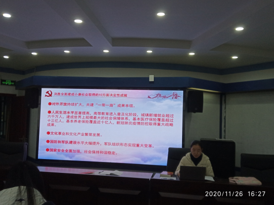 11月27日下午,葛洲坝中学第二党支部在417会议室进行十一月主题党日活动,认真学习贯彻党的十九届五中全会精神,全体党员参加。