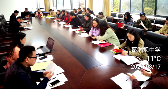 2021年3月17日,中共宜昌市葛洲坝中学第三支部召开了三月主题党日,会议主题为:采茶支农惠农,助力乡村振兴。会议分为九部分:缴纳党费、重温入党誓词、集体诵读党章、学习传达市纪委六届六次全会精神、学习习近平总书记在《2021年春节团拜会上的讲话》、分小组学习交流习近平总书记《在全国脱贫攻坚总结表彰大会上的讲话》和习近平总书记在党史教育动员大会上的讲话、反馈市直机关工委检查我校党建创建的情况、民主评议党员、部署支委工作。