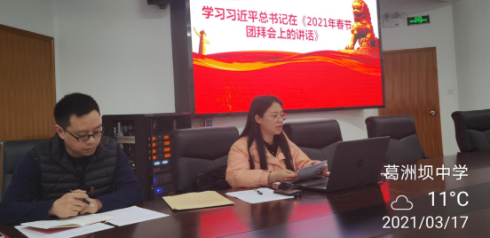 支部专职副书记邓万丹同志为大家解读习近平总书记在《2021年春节团拜会上的讲话》,并主持了民主评议党员工作。经过投票,我支部推选出优秀等次党员9人,分别为:齐同新、邓万丹、靳其春、胡安林、喻愿霞、马德俊、王煊、王诗韵、谢敏。随后,邓万丹副书记重点部署了“采茶支农惠农,助力乡村振兴”活动安排。