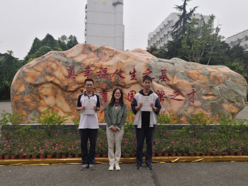 全国三等奖王戴瑞同学(左)竞赛教练邓晶晶老师(中)全国二等奖周楚峰同学(右)