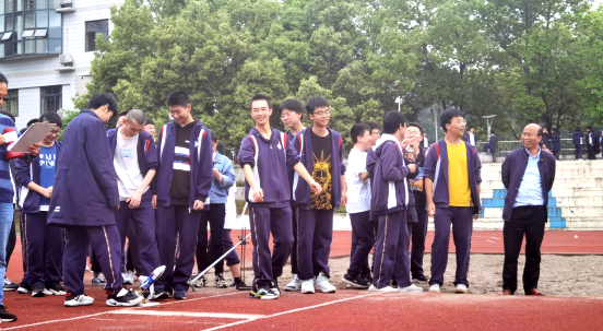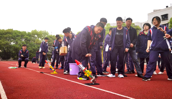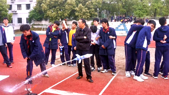 一个个水火箭相继划出一道道优美的弧线,一飞冲天。操场上的欢呼声此起彼伏,大家都期待着更惊人的成绩,100米、120米、140米......偶尔有些作品偏离轨道,或是动力不足,同学们都哄堂大笑。青春的气息萦绕在葛中的操场上,成绩不重要,过程和体验最重要!
