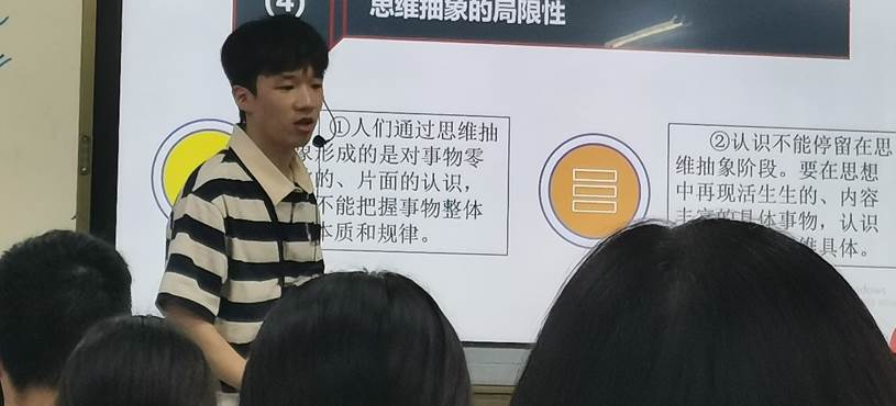 三峡大学马克思主义学院研究生龙伟在我校做实习汇报展示课,龙伟授课主题为《体会认识发展的历程》,从白象方便面说起,深入浅出、生动具体、详略得当,课堂气氛活跃,一步步引导学生深入思考,最后引导学生用所学知识为白象企业建言献策。陈运普对其评价道,“这堂课既有教学目标的达成又有学科核心素养的落实,一上讲台便觉台风稳重,上课声音洪亮,思路清晰,表达流畅。凭借葛中这个平台,依靠自身的勤奋努力,龙伟正逐步成为一名优秀的思政教师,感谢葛中老师的精心指导。”黄家军也对龙伟给予了高度的评价,认为其成长快,领悟能力高,能迅速和学生拉近距离,成为了学生们非常喜欢的教师。