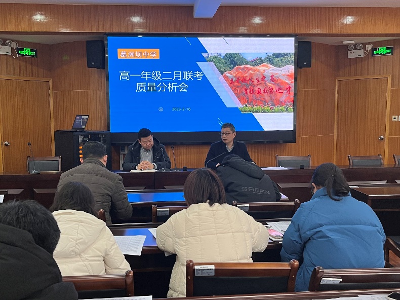 2023年2月16日上午。葛洲坝中学高一年级组在汇贤楼会议室216举行了高一年级二月联考质量分析会。党委书记谭志鸿,教务处主任董浩,年级主任崔征,年级副主任肖盼盼及部分高一教师和班主任参加会议。