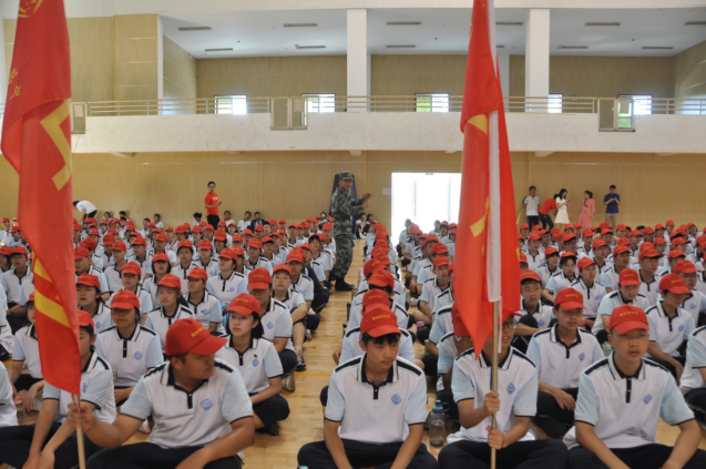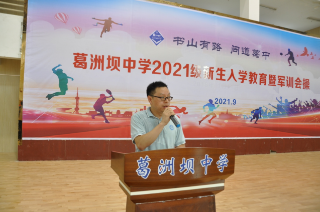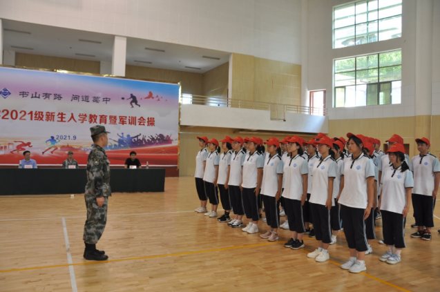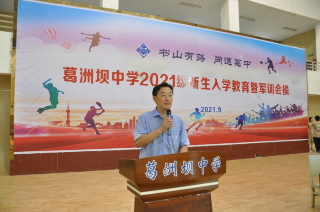 2021年9月25日14点,宜昌市葛洲坝中学在体育馆隆重举行2021级新生军训会操表演。宜昌市西陵区人武部部长邹勇上校、葛洲坝中学校长吴益民老师、副校长靳其春老师、学工处主任李克老师及学校部分老师出席本次会操表演。