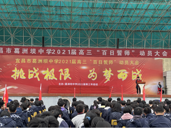 春回大地,万象更新;旌旗猎猎,誓言铮铮。2月23日上午9:30,葛洲坝中学2021届高三年级“挑战极限,为梦而战”百日誓师大会在学校大操场隆重举行。校长谭子刚老师、党委书记田苹老师,纪委书记万青春老师、副校长吴爱铭老师、副校长颜颉老师、副校长靳其春老师、学校中层干部及高三全体老师出席了本次大会。大会由2021届高三学生廖晖主持。