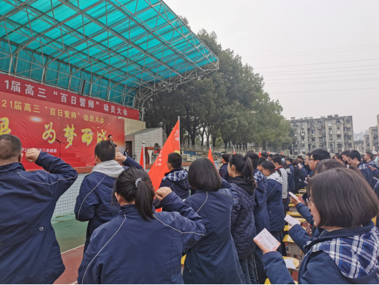 战鼓铮铮,誓言声声。在全体校领导与高三教师的见证下,由1812班梁城斌同学领誓,高三年级全体同学右手握拳,激情宣誓。“挑战极限,为梦而战!百日涨百分!百日涨百分!百日涨百分!”激昂高亢的宣誓发出同一个呐喊,点燃了同学们冲刺的豪情。