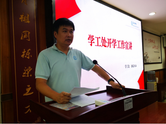 立德树人,德育为先。为进一步落实立德树人根本任务,发展素质教育,充实我校“润德”德育品牌,9月14日下午17点,2022-2023学年第一学期第一次德育工作会在格物楼3008会议室召开。会议第一项,学工处主任李克和团委副书记代梦晗围绕开学工作重点内容及开学具体事宜进行部署。李主任指出,开学初学校德育工作的重点为:仪容仪表检查、卫生打扫、寝室管理、文明班级考核、班级值周、晨午检制度落实,学工处将联