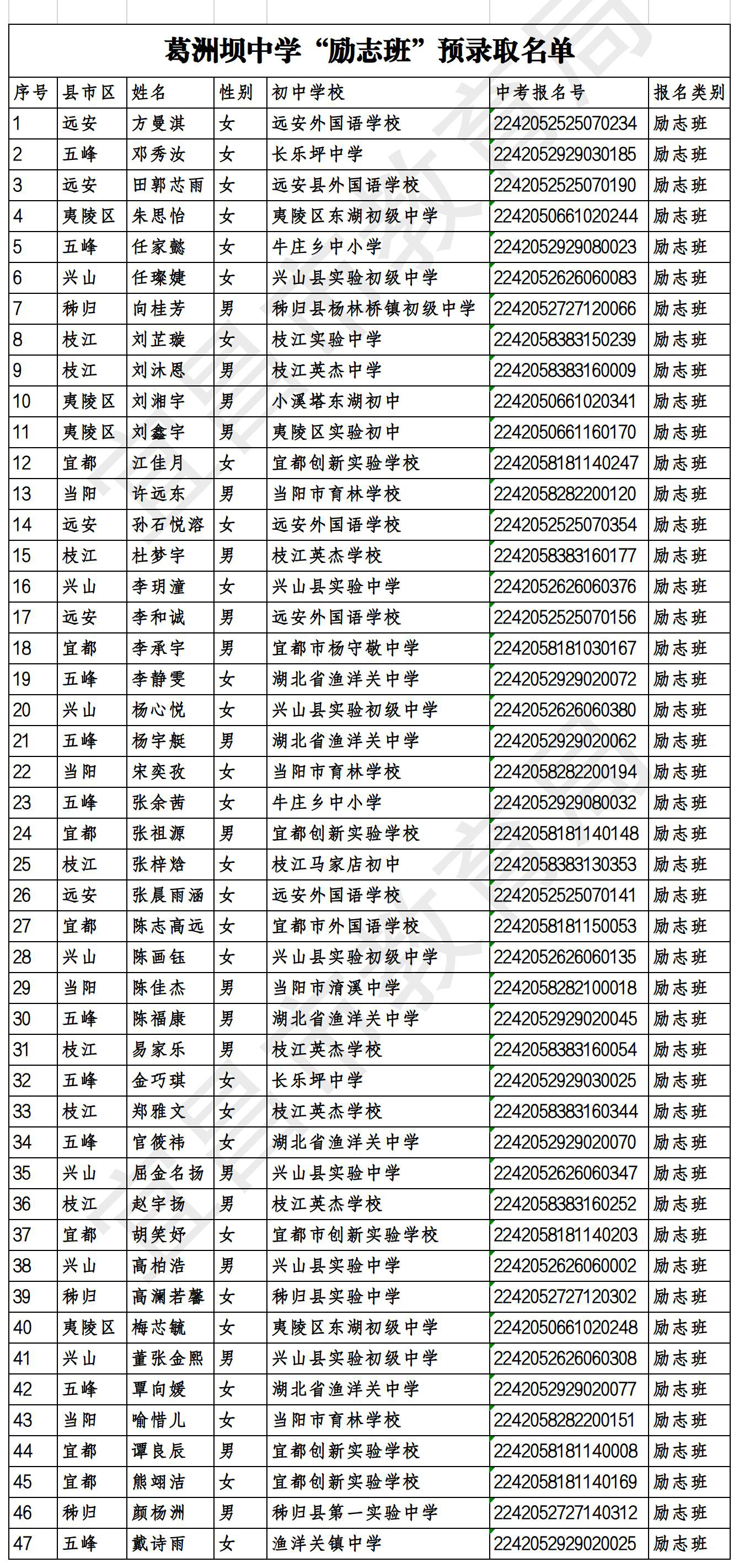 根据宜昌市教育局下发的《关于做好2022年城区综合高中特殊计划招生工作的通知》文件要求,现将2022年葛洲坝中学“励志班”预录取名单(按姓氏笔画排序)公示如下。公示时间:7月9日--7月11日,投诉举报电话:0717-6788013,0717-6788014,值班电话:0717-6788001 。