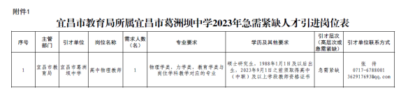 根据《宜昌市高层次和急需紧缺人才引进工作暂行办法》(宜人社发〔2022〕16号)和《市委人才办 市人社局关于严肃高层次创新创业人才和急需紧缺人才引进工作纪律的通知》(宜人办文〔2019〕2号)规定,结合宜昌市葛洲坝中学实际需要,拟开展急需紧缺人才引进工作,现公告如下:
