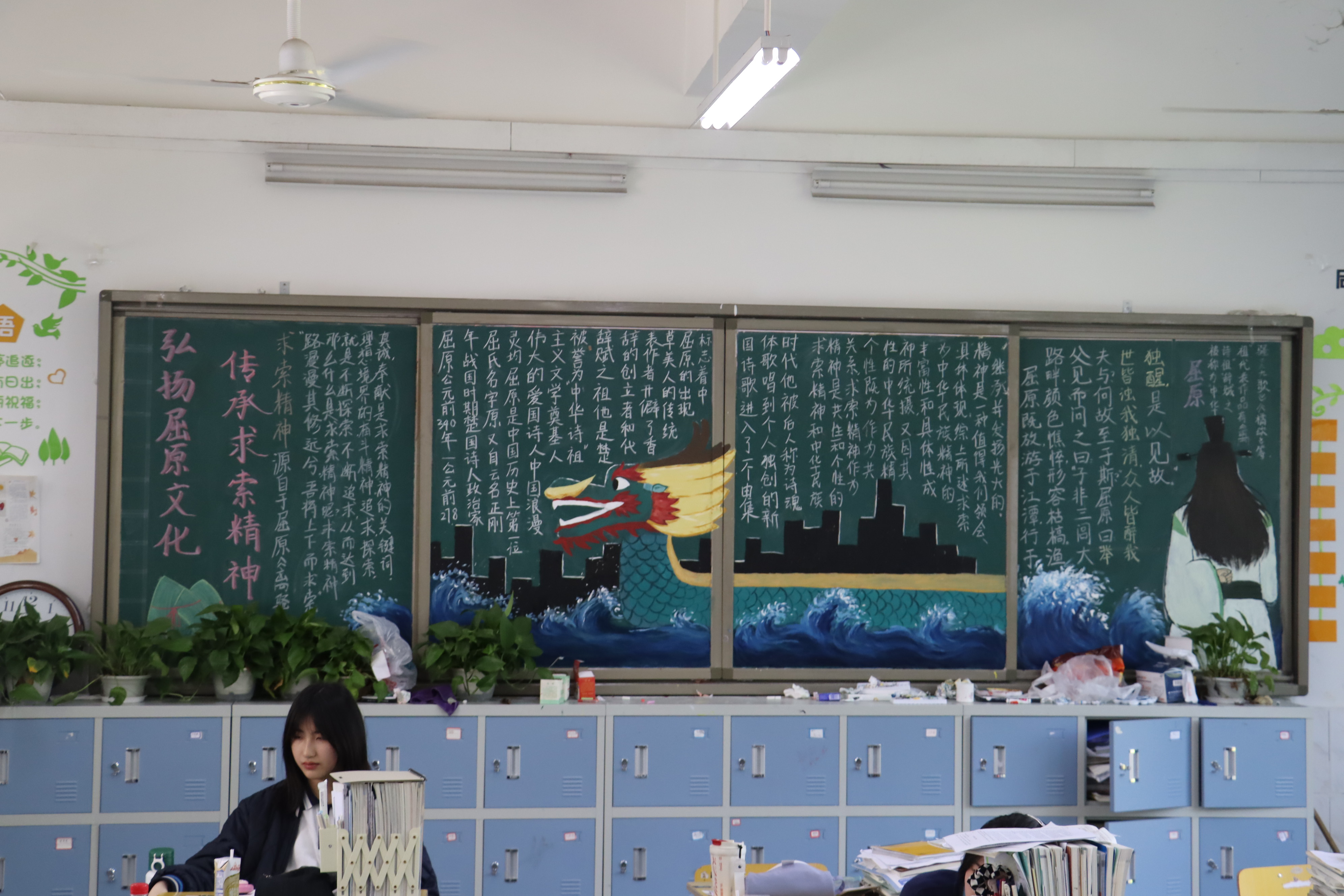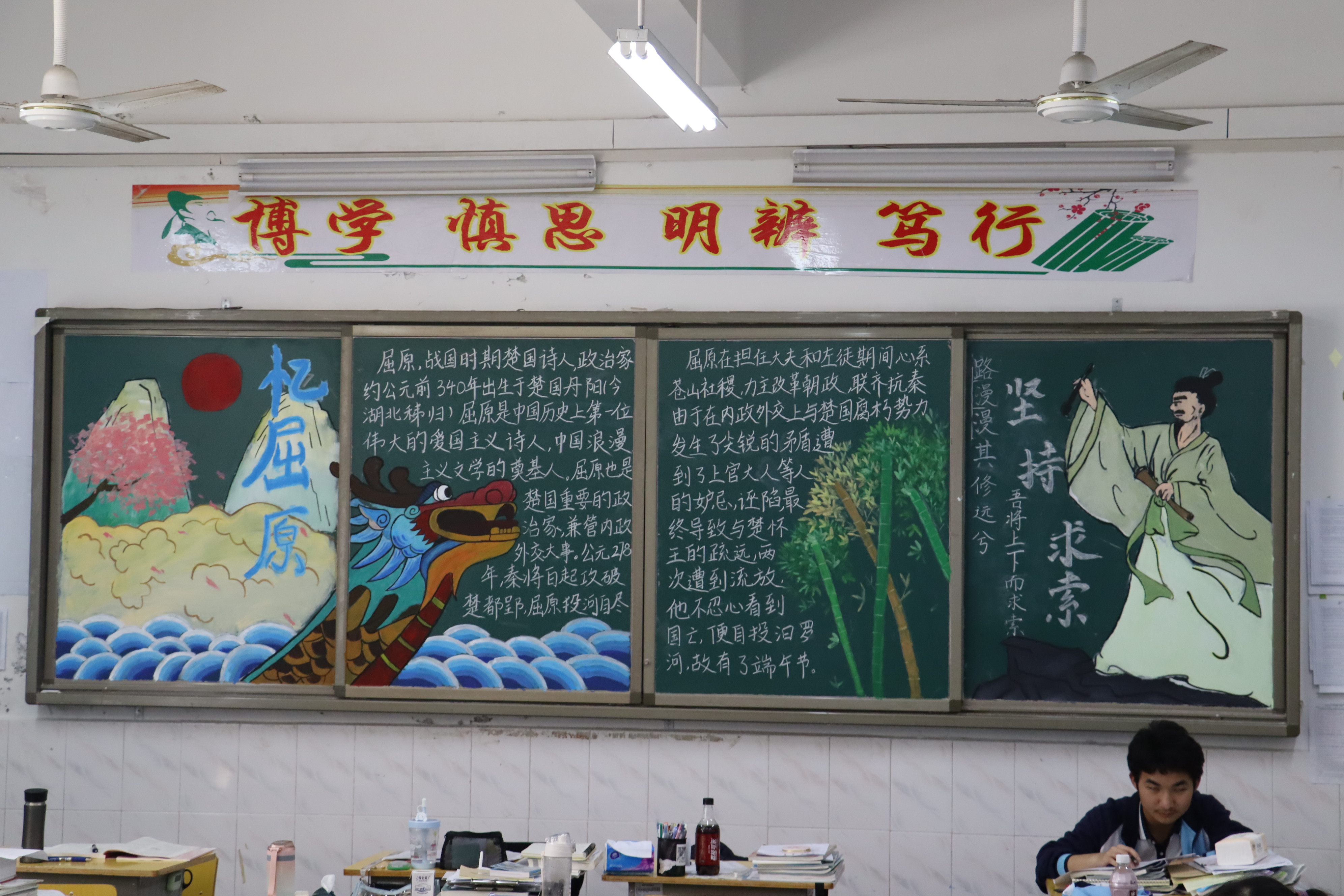 屈原是中国伟大的爱国诗人,中国浪漫主义文学的奠基人,创立了“与天地兮同寿,与日月兮同光”的楚辞文体,发明了“惟草木之落兮,恐美人之迟暮”的香草美人传统,被誉为“辞赋之祖。近日,我校组织全校学生开展了以“弘扬屈原文化,传承求索精神”为主题的黑板报评比活动。各班团支部认真准备、精心设计,呈现了一幅幅精彩的主题板报。