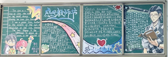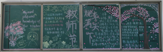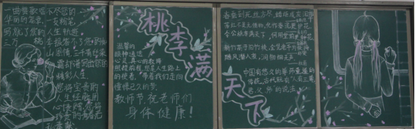 9月10日是一个秋高气爽、阳光明媚的日子,这一天也是一个特殊的日子——教师节。为庆祝第37个教师节的到来,校团委组织同学们开展主题为“文字传深情,笔墨谢师恩”的教师节黑板报设计活动。同学们纷纷拿起粉笔在黑板上画出了对老师的祝福,表达了对老师的敬爱之情。经过校团委老师和宣传部同学的评选,最终评比结果如下:
