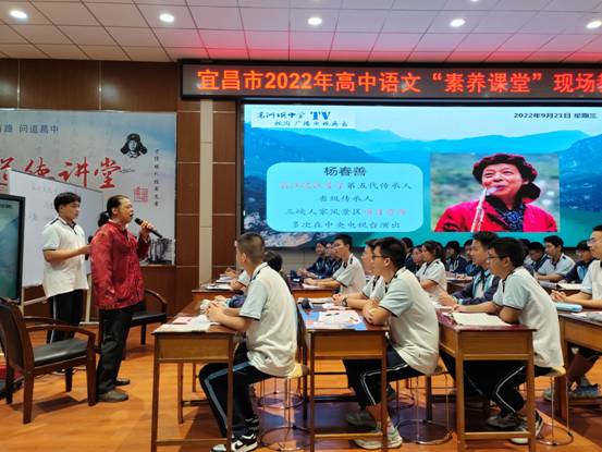 2022年9月21日,宜昌市2022年高中语文“素养课堂”现场教学竞赛在我校进行,我校艾超鹏老师的竞赛课《地方民歌峡江号子访谈指导》授课现场,邀请到国家级非物质文化遗产长江峡江号子省级传承人杨春善,为同学们倾情演绎。