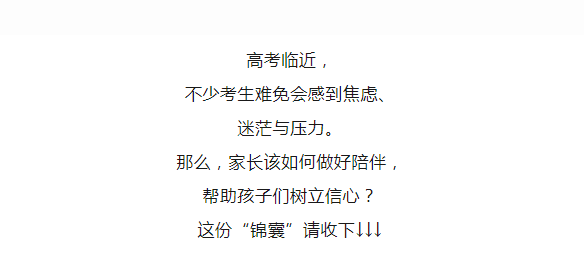 高考临近,不少考生难免会感到焦虑、迷茫与压力。那么,家长该如何做好陪伴,帮助孩子们树立信心?这份“锦囊”请收下↓↓↓