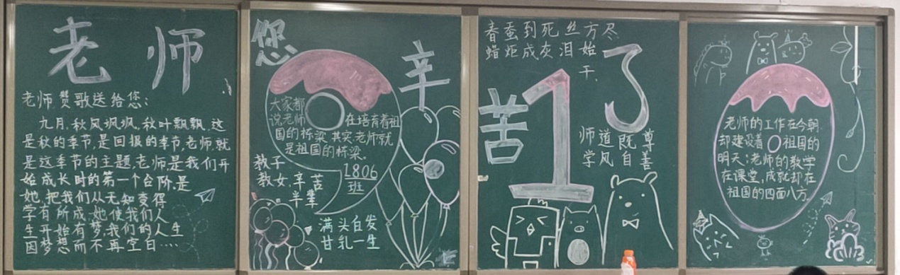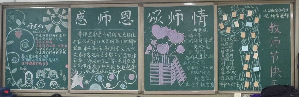 各班同学积极响应,怀着对老师的崇高敬意,发挥自己的聪明才智,于9月7日纷纷开展教师节主题班会,并启动黑板报设计。在各位班主任的精心指导、同学们的用心策划下,办出了让老师感动的主题班会,一版版板报,主题鲜明,内容生动,设计新颖,从不同角度赞美了老师们无私奉献的精神,传递着同学们的真心祝福。