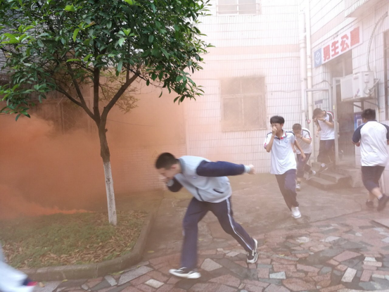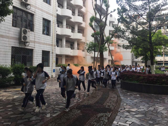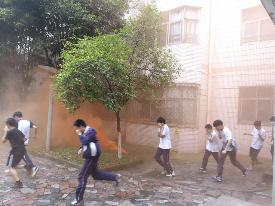 各年级各部门高度重视,随着警报声的急速响起,仿真烟雾的升腾,各楼层、楼梯负责的老师以最快的速度到达所在的岗位,上课老师和各班班主任按照各自职责积极组织学生疏散。全体学生在班主任们的组织下,从寝室、教室快速下楼,他们用湿毛巾或湿纸巾捂着口鼻,冒着浓烟,以最快的速度安全到达运动场。