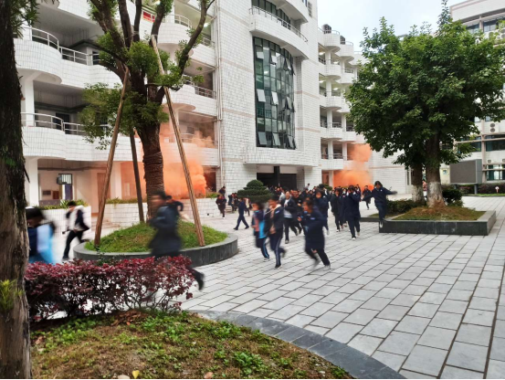 17点05分,随着消防报警声的响起,总务处准备的仿真烟雾缭绕,各班主任、楼层指挥人员迅速到班到岗,沉着冷静地指挥学生用湿毛巾捂住口、鼻,尽量将身体放低,紧急撤离教学楼,安全、快速、有序地疏散到学校操场。