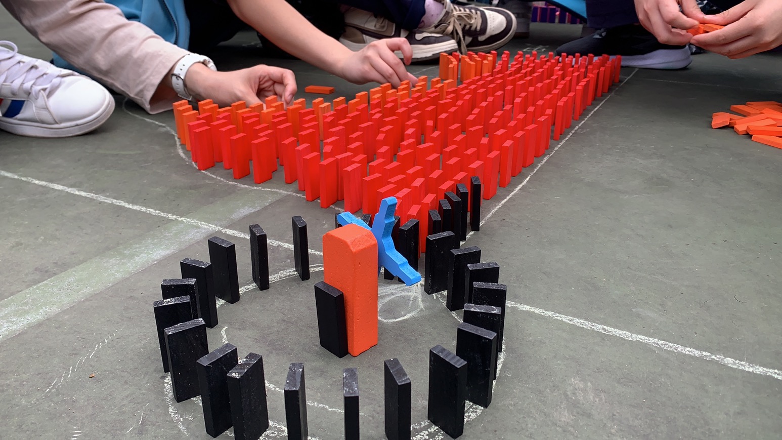 5月12日下午,宜昌市葛洲坝中学第十四届科技节系列活动之多米诺骨牌比赛于篮球场上顺利举行,一个个小小的的骨牌在他们的手中如同绣花的针和线,一点一点绣出他们的图案。一个个小小的的骨牌在他们的手中又如同建筑的砖和瓦,一点一点砌出最高的墙。同学们或蹲或坐,一块一块地将骨牌摆到指定位置。比赛进行的并不顺利,骨牌时不时就突然倒塌,高墙倒一次就要从头再来,图案倒一片就要重新扶起。有的同学腿已经蹲麻了,但他们