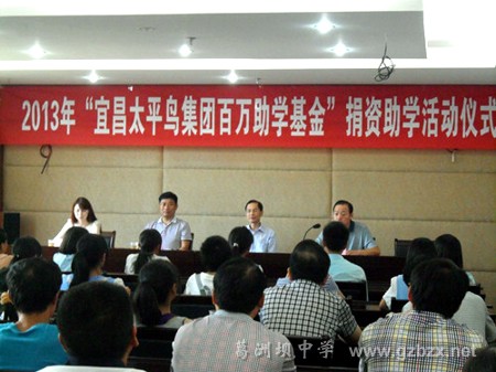 8月30日下午,2013年“宜昌太平鸟集团百万助学基金”捐资助学活动仪式在市教育局举行。市教育局副局长李伟、太平鸟集团副总经理胡兴、太平鸟创业办公室主任刘小燕等出席了此次活动。仪式上,李伟副局长发表讲话,在讲话中他希望受到资助的同学们能饮水思源,怀着一颗感恩的心在大学里努力学习,将来能够凭借自己的学识回馈社会,回馈企业,为早日实现中国梦贡献自己的力量。胡兴副总经理也在讲话中以“穷且益坚,不坠青云