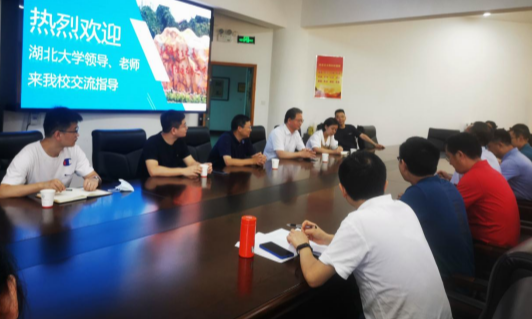 6月28日上午,湖北大学党委常委檀坤华一行六人来我校交流指导,学校校长吴益民、副校长颜颉、副校长靳其春、工会主席李群热情接待。