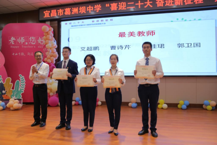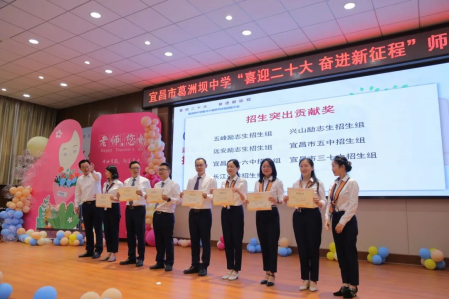 2021-2022年度“招生突出贡献先进团队”、“最美教师”、“宜昌市教育局优秀共产党员”、“宜昌市教育局优秀党务工作者”、“宜昌市教育局先进基层党组织”称号获得者先后上台接受表彰。