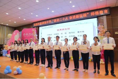 2021-2022学年年度优秀班主任纷纷上台,由纪委书记万青春、副校长吴爱铭、副校长颜颉为他们颁奖。