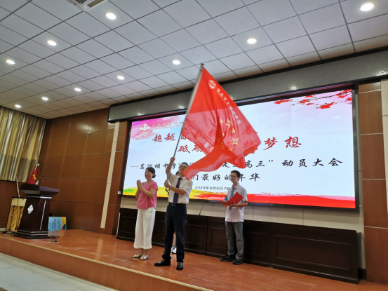 田苹书记向新高三授战旗,由年级主任胡安林接旗。随后,学校领导为各班班主任授旗。战旗的授予,是责任的赋予,是精神的传递,更是使命的延续。
