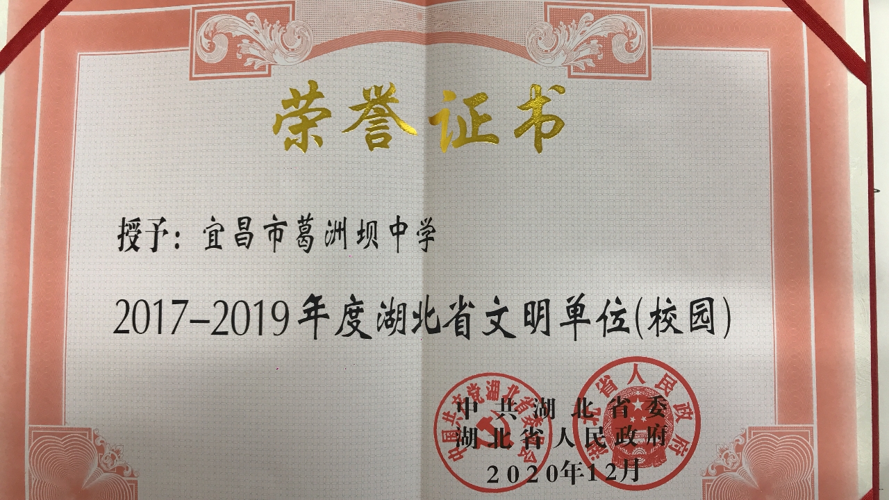 我校以创建“全国文明校园”为目标,深入贯彻落实党的十九大精神和习近平新时代中国特色社会主义思想,坚持立德树人,积极践行社会主义核心价值观,教育教学质量持续提升,社会美誉度日益增强。2020年12月宜昌市葛洲坝中学被中共湖北省委、湖北省人民政府授予湖北省“2017—2019年度湖北省文明校园”称号。
