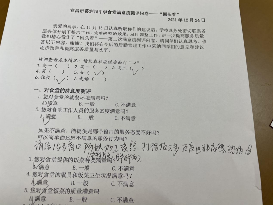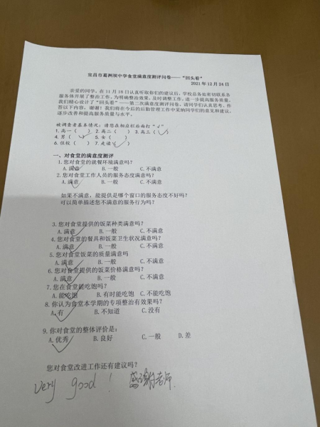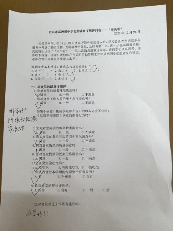在本次上交的104张问卷中,过半数(56名)学生对食堂给了“全A”的超高评价,更有102名(占比98.1%)学生认为学校的食堂专项整治有效果!问卷调查结果显示96%的同学对食堂满意。有的学生还直接在问卷上写上了诸如“阿姨变温柔了”“改进后真的好”“好的没话说”等夸奖。由此说明,前一阶段的食堂专项整治工作卓有成效。