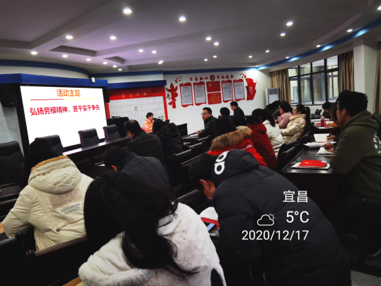 2020年12月17日,中共宜昌市葛洲坝中学第三支部于办公楼416会议室召开了12月主题党日,主题为:弘扬劳模精神,苦干实干争先。会议分为八部分:缴纳党费、重温入党誓词、诵读党章、十九届五中全会宣讲报告、学“习”时间、学习全国劳动模范和先进工作者事迹、支部达标定级问卷提纲、统筹兼顾 切实落实工作任务。本次会议由支部专职副书记邓万丹同志主持,全体党员的热情参与。