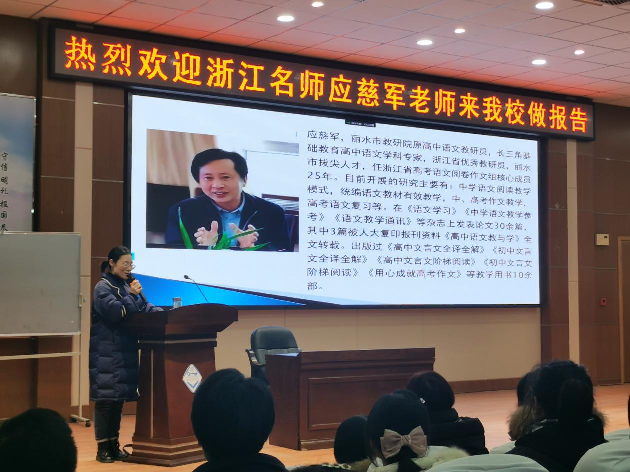 作文有法,贵在得法。为有效提高学生的写作能力,领悟作文之道,2月13日,我校特邀浙江省丽水市教研院原高中语文教研员、长三角基础教育高中语文学科专家、浙江省优秀教研员、丽水市拔尖人才应慈军老师莅临讲座指导,为葛中学子传经送宝、指点迷津。整场讲座采取线上线下双线同时进行的形式,实现葛中三个年级全覆盖,语文组全体老师陪同学生一起参会学习。
