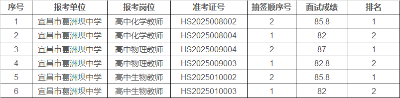根据《宜昌市2025年“招才兴业”教育系统事业单位人才引进校园招聘公告•华中师范大学站》安排,现将宜昌市葛洲坝中学2025年“招才兴业”人才引进校园招聘各岗位面试成绩公告如下: