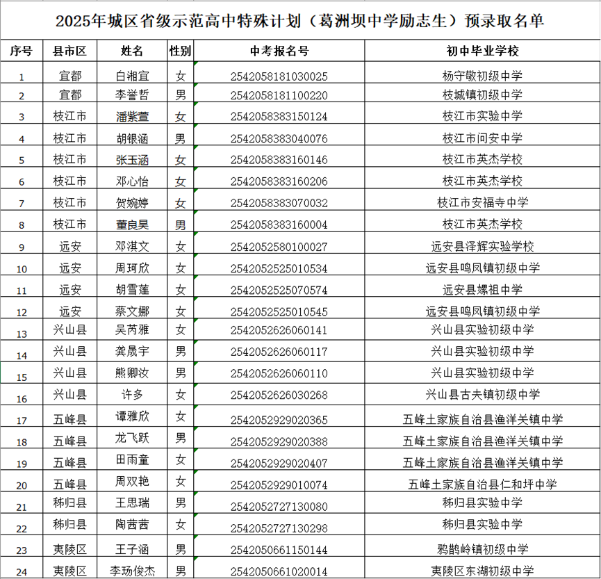 根据宜昌市教育局印发的《市教育局关于做好 2025 年城区省级示范高中特殊计划招生工作的通知》文件要求,现将学校2025年“励志班”预录取名单公示如下。公示时间:7月10日--7月11日,公示期间如有疑义,请致电:0717-6788058;0717-6788014。