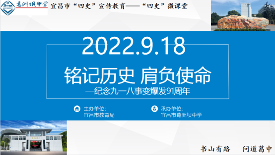 葛洲坝中学开展纪念九一八事变爆发91周年系列活动铭记历史肩负使命——纪念九一八事变爆发91周年为引导同学们铭记抗日战争历史,厚植爱国主义情怀,铭记为民族英勇献身的烈士,勿忘国耻,接续奋斗,树立“铭记历史、缅怀先烈、珍爱和平,不忘初心、勇担使命、开创未来”的责任意识,2022年9月18日晚6:00,我校学工处组织全校学生开展了主题为“铭记历史 肩负使命——纪念九一八事变爆发91周年”的“四史”