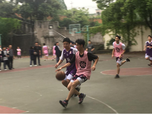没有比赛项目的同学们围在赛场外成为了啦啦队,有组织的口号和自发的助威交织在一起,成为了名为凝聚力的旋律响彻校园,班级对抗不仅在赛场上的运动员之间,也在两班阵营的啦啦队员之间。运动员运球进攻时有激动紧张的尖叫,进球时有伴随着手舞足蹈的欢呼,失误时有安心的宽慰,每一个班都不愿自己的助威声小过对方班级,一声盖过一声,层层叠叠的声浪也冲进了运动员的心间。