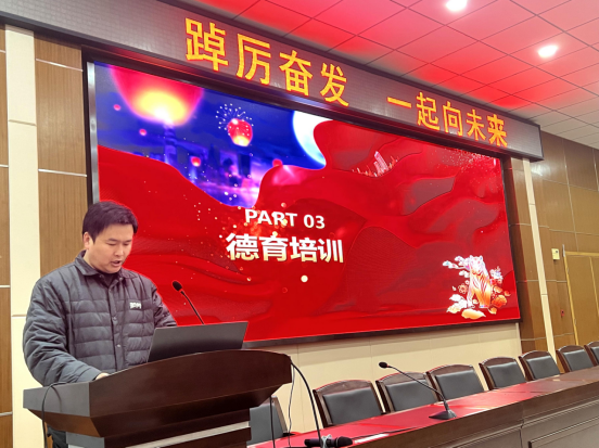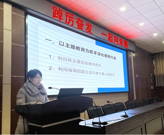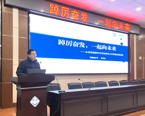 会议最后,学校副校长靳其春老师作《踔厉奋发,一起向未来》的主题讲话,他以从容迎接新时代学校德育工作面临的挑战为切入点对全体教师进行了德育管理培训。
