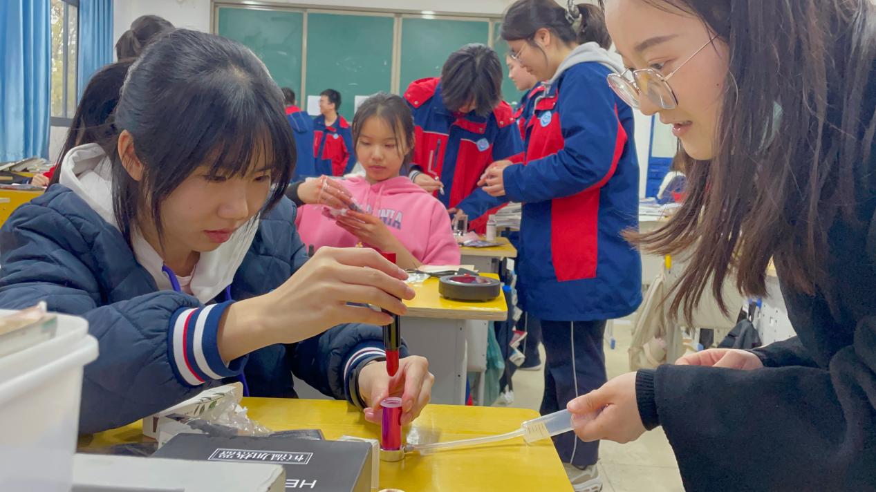 在老师细致具体的讲解之后,我们小组开始尝试并成功做出了7支口红。在体验成功与快乐的同时,提高了自己的动手能力。于我而言,这是一次奇妙的体验,我充分感受到了化学学科的神奇。看似工序重重、制作复杂的口红却是如此的简单。我会坚持对化学的热爱,并将这份热爱努力传递下去。(课程:《口红的制作》)