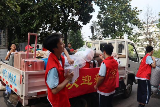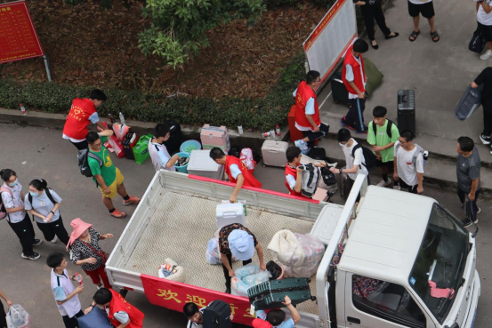 新人至此,传奇开始!南风已起,得偿所愿,蝉鸣的夏季,葛中遇见你。礼仪社志愿者热情地为家长解疑答惑,小红帽志愿者主动帮助新生将行李搬上转运车。