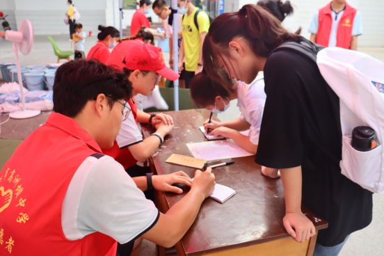 宿舍楼下,宿管阿姨微笑相迎,热情地提示新生看宿舍分配表、登记领取床品,志愿者也热情服务,帮助新生搬运行李,上上下下无数趟,汗水早已湿透他们的衣服,但他们依然用热情和微笑来服务新生。这是“葛中之光”志愿者的一诺无悔。