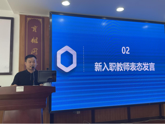 周鹏老师代表新教师做表态发言,他表示青春是资本,自信是个性,拼搏是誓言。在今后的工作中,青年教师将努力做到:对教书育人存敬畏之心,对学校和师傅存感恩之心。刻苦钻研,提升自我,扎实工作,争先创优。