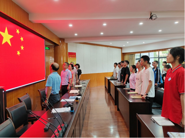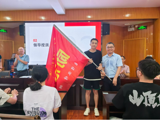 国旗冉冉升起,战旗也迎风招展,学校党委书记谭志鸿老师为2023级励志班授旗,飒飒班级,铿锵激越,代表着期许与胜利,也象征着传承和使命。