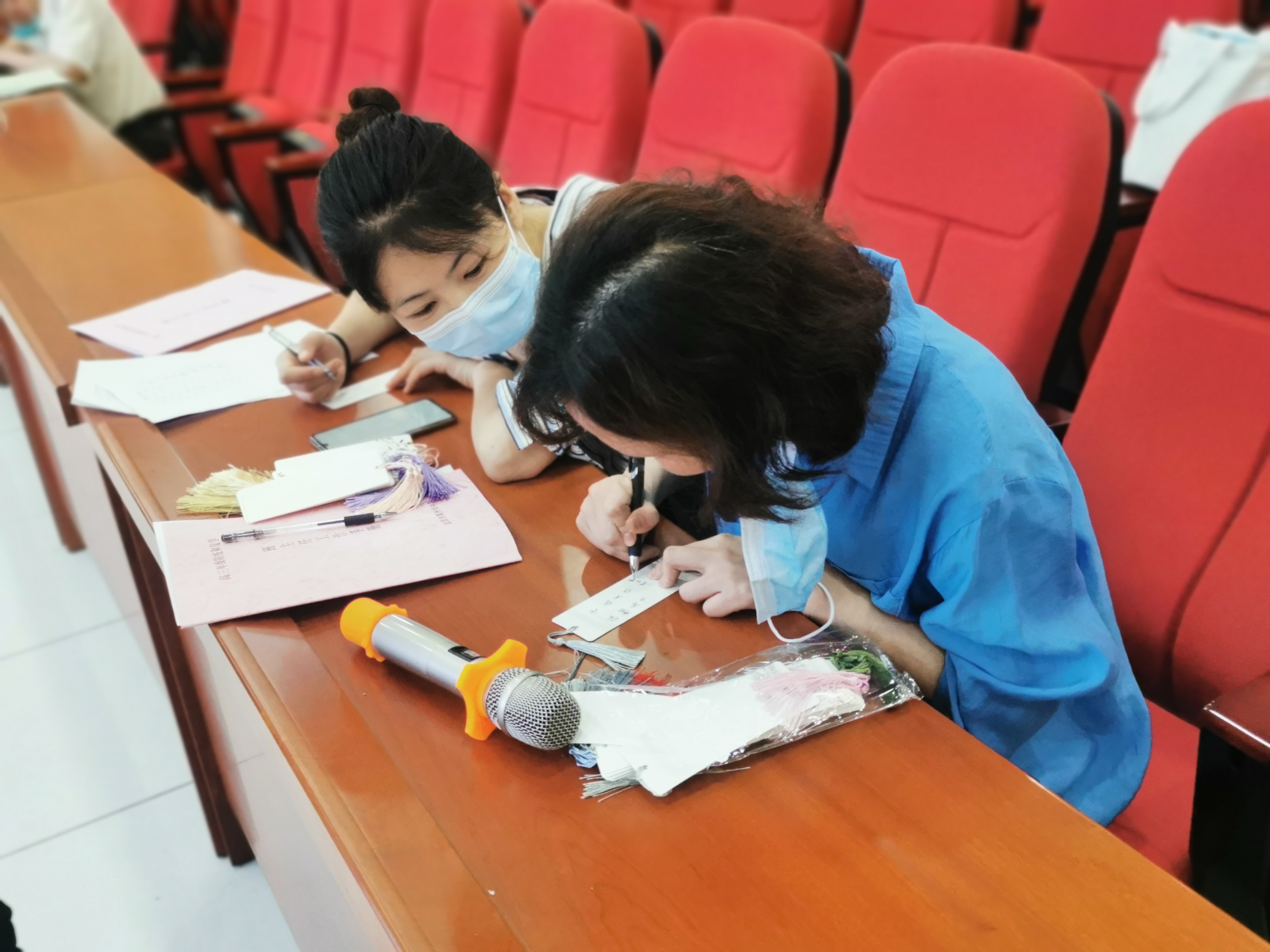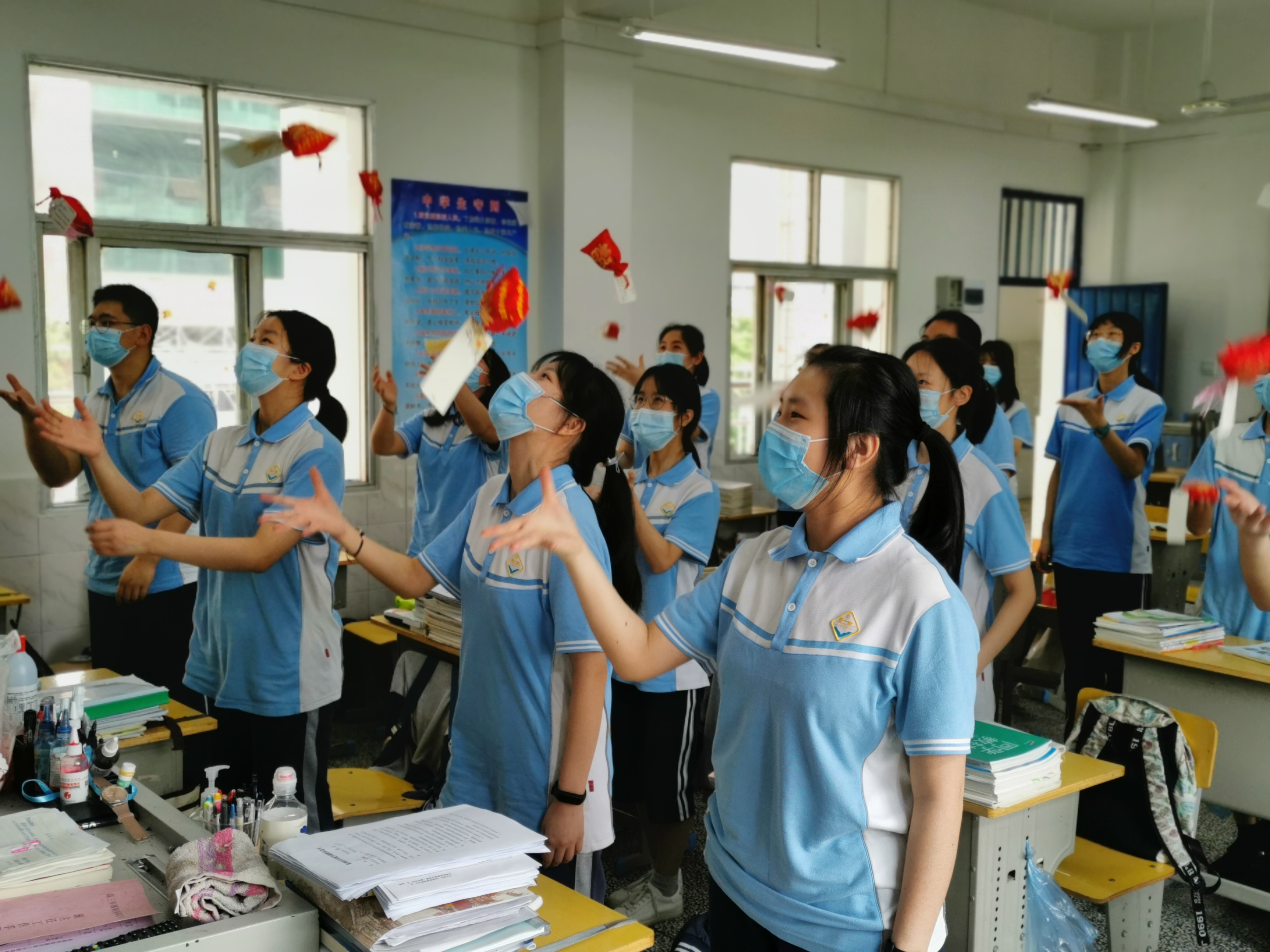 高三复学首日,抽到防疫香囊的同学感到激动欣喜,迫不及待查看老师留下的祝福,感恩老师们精心准备的这份特殊礼物,并以合唱班歌的形式表达了感激之情。